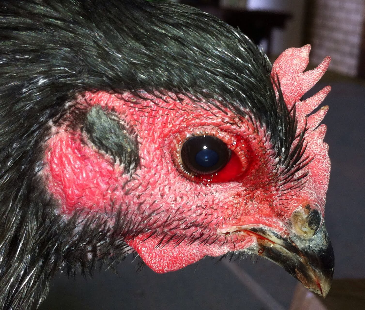 Once the eye was cleaned up, she stopped rubbing at it.I kept her isolated in a small cage for an hour or two, just to make sure the wound had scabbed over, and then put her back with her mates where she immediately stuck her head in the feed hopper, none the worse for wear. I think this will heal without spoiling her looks. I hope so, anyway.